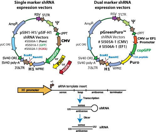 The pSIH and pSIF shRNA cloning vectors are available in a variety of formats. Choose from a CMV, EF1, PGK, or CMV/Ferritin promoter driving expression of the copGFP reporter or Puromycin resistance gene. For shRNA expression, choose from the H1 or U6 promoter. The pGreenPuro™ shRNA vector enables both GFP monitoring and Puromycin selection.