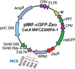 —Polycistronic expression cassette includes copGFP fluorescent reporter and Zeocin resistance marker on the same transcript as the miRNA to enable tracking and selecting cells expressing the miRNA.