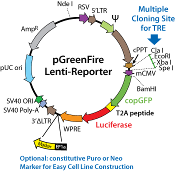 pGreenFire1 (pGF1)is a versatile HIV-based lentivector that co-expresses destabilized copGFP and Firefly Luciferase enabling the detection of both GFP signals as well as Luciferase for quantitative transcription activation reporter assays.