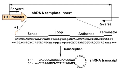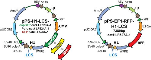 shRNA cassette can be directly assembled from short, tagged oligos and mixed with ready-to-use vector for rapid construction. High levels of shRNA expression are achieved using the built-in H1 promoter. Positively expressing cells can be sorted using the CMV promoter-driven GFP reporter (Cat# LF523A-1), RFP reporter (Cat# LF526A-1) or selected for Puromycin resistance (Cat# LF524A-1). Alternatively, you can choose to have the RFP marker expressed from an EF1 promoter (Cat# LF527A-1). See plasmid vector maps below for additional details.